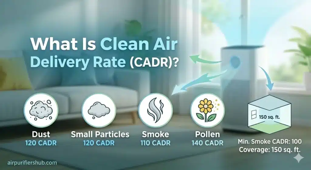 CADR is a score in CFM that shows how fast an air purifier removes particles. It reports three numbers for smoke, dust, and pollen. These numbers show how well it removes small, mid-size, and larger particles in lab tests.